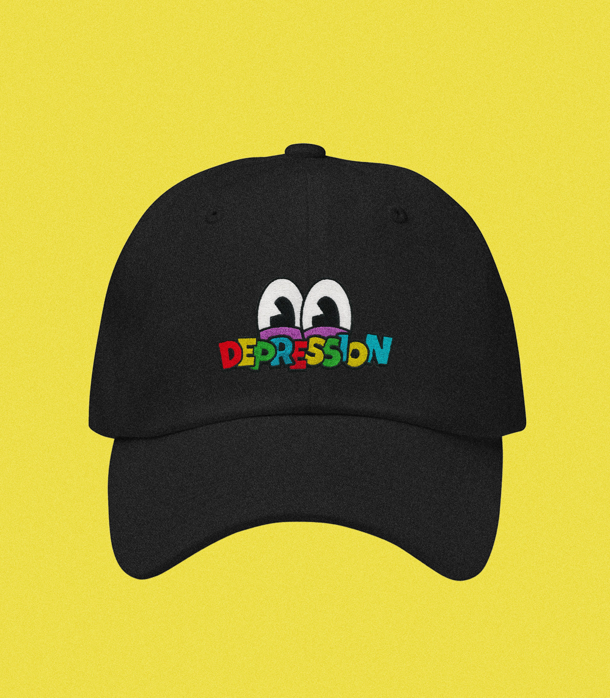A low-profile black dad cap stitched with rainbow letters that spell it out loud: DEPRESSION — complete with cartoon eyes peeking above. Dark humor, soft cotton, and a fit that works anywhere from the streets to your bad brain days.