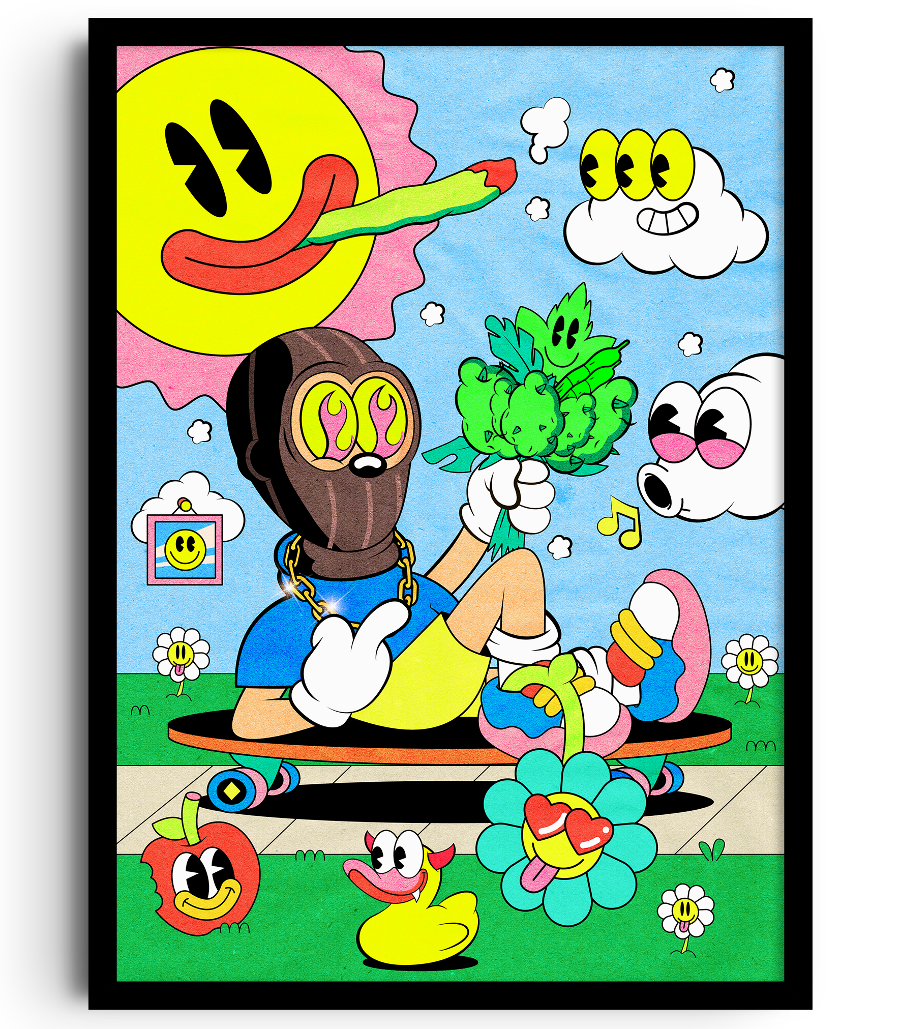 A sunny chaos scene straight from the Ovcharka universe — masked Mike chilling with smiling broccoli, trippy flowers, and clouds that won’t stop staring. A mix of cartoon joy and surreal weirdness that turns any wall into a playground.