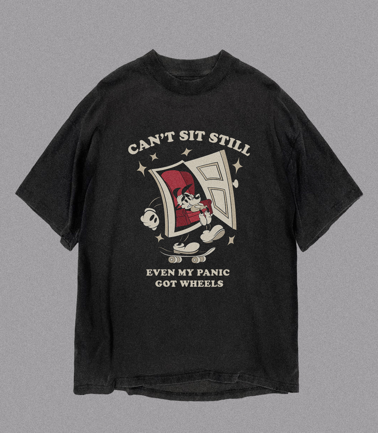 “Panic” rides on jittery energy and cartoon chaos—vintage black tee with our door-on-wheels graphic and a message for every fast-twitch heart. Throw it on when your brain’s doing 120 km/h and you still look cool doing it.