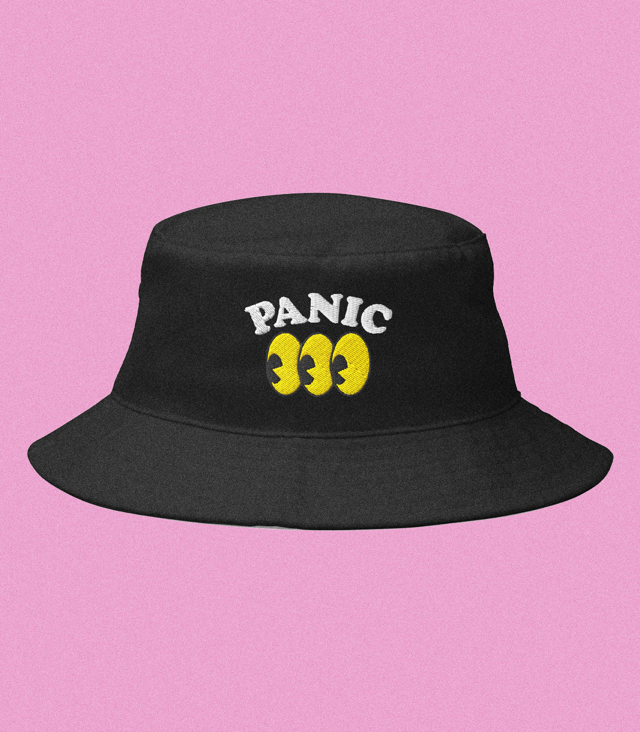 Black cotton bucket hat with big yellow eyes staring back at the world. Embroidered PANIC on the crown — part warning, part fashion statement. Built from durable twill with breathable eyelets, it’s perfect for festivals, streets, or just hiding your face when the vibe gets too loud.