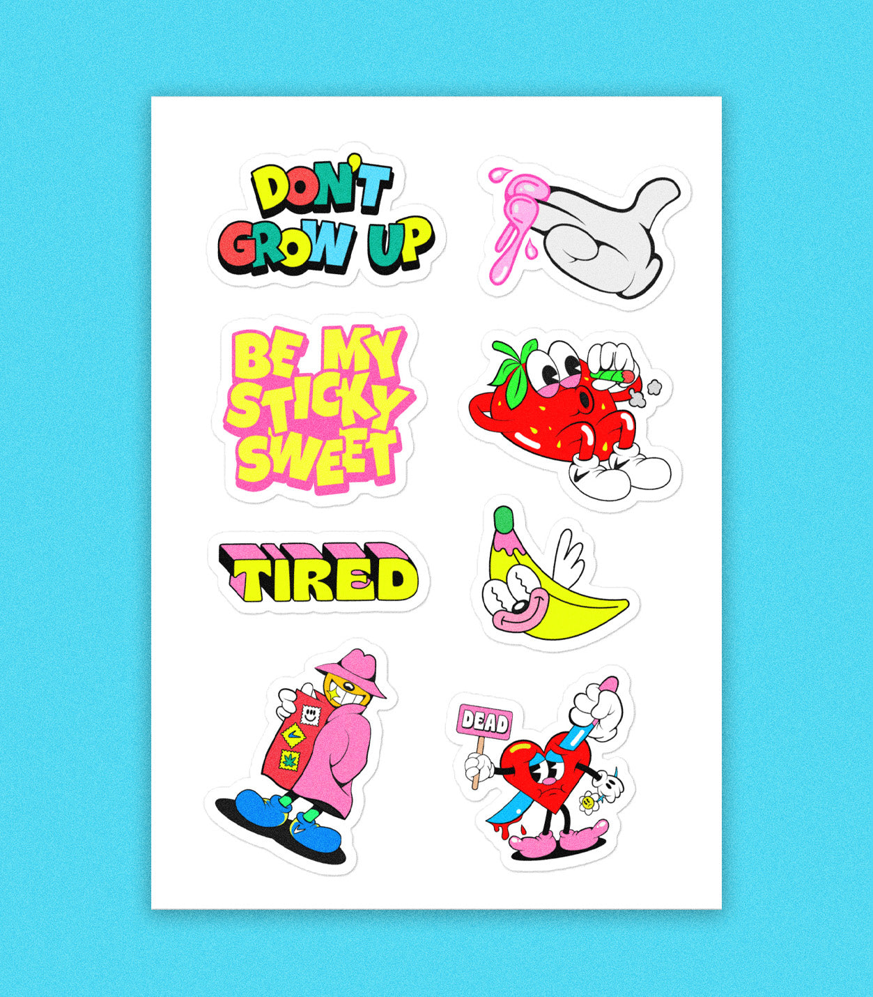 A whole squad of weirdos in one glossy sheet. From “Don’t Grow Up” to “Be My Sticky Sweet,” sleepy bananas and shady dealers — these stickers bring Ovcharka’s cult universe straight to your laptop, phone, or wherever you decide to stick the madness.