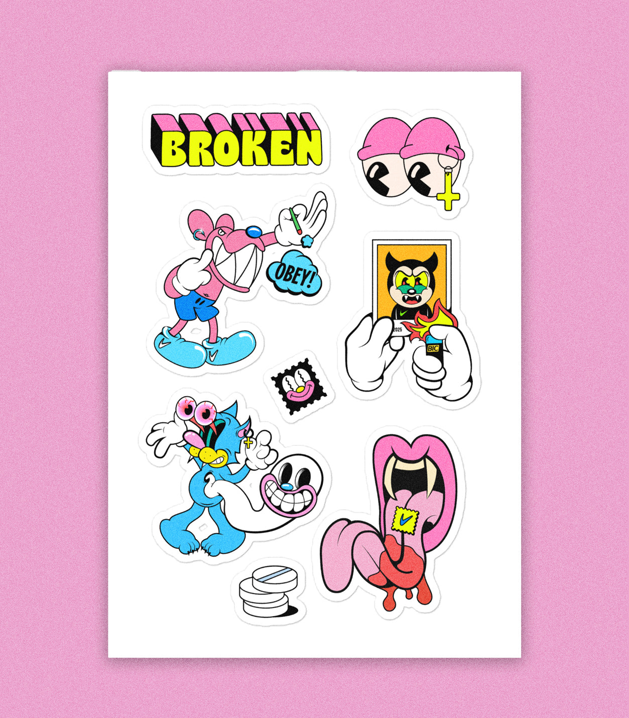 A pack of cracked smiles, twisted eyes, and cartoon chaos. From “BROKEN” to screaming mouths and freaky blue characters, this glossy sheet drags pieces of the Ovcharka universe right onto your laptop, phone, or notebook.